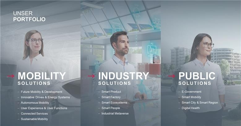 Für uns sind Kosteneffizienz und der Einsatz modernster Verfahren und Techniken, wie Industrial Metaverse und künstliche Intelligenz, selbstverständlich. Dieses Know-how transferieren wir in drei unser Geschäftsfelder gleichermaßen: Für Mobility Solutions, Industry Solutions als auch für die Public Solutions. Und das weltweit.